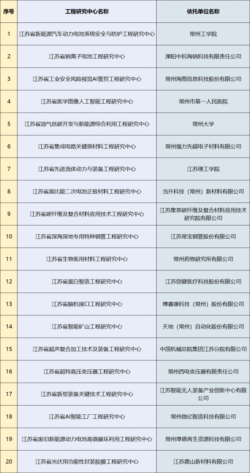 近日,省发改委发布了《2024年江苏省工程研究中心拟认定名单公示》,全省212个企事业单位成功进入省级工程研究中心公示名单,常州共有20个进入公示名单,获公示数量创历史新高,在省内排第二名,申报通过率100%。