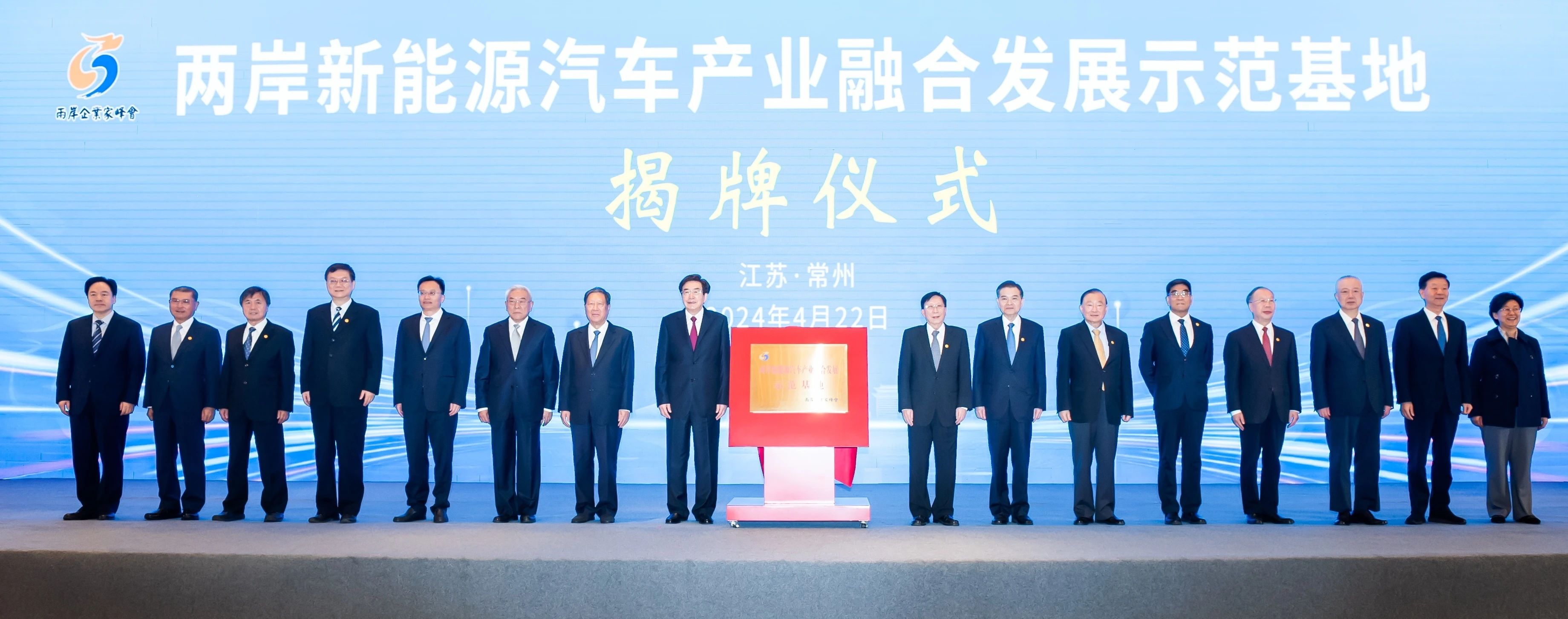 4月22日,两岸新能源汽车产业融合发展示范基地揭牌仪式在常州举行。两岸企业家峰会大陆方面理事长郭金龙、副理事长张平,台湾方面理事长刘兆玄、副理事长陈瑞隆,江苏省委常委、省委统战部部长胡广杰,江苏省